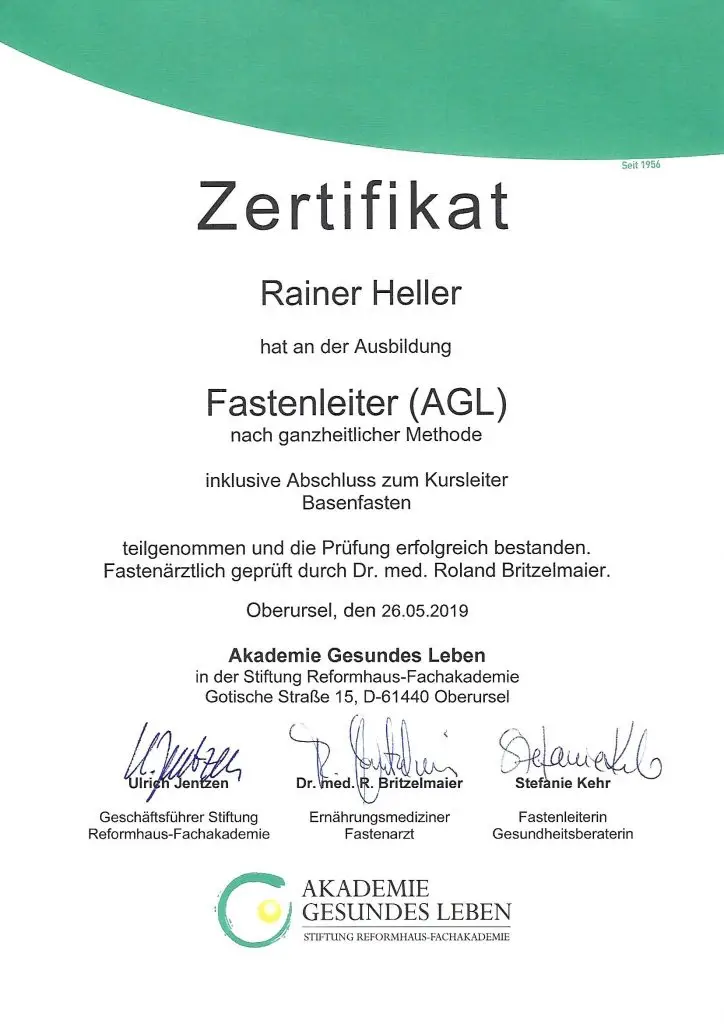 2019 absolvierte Rainer Heller den Kurs Basenfasten an der Akademie Gesundes Leben in Oberursel und ist seit dem offiziell als Fastenleiter tätig