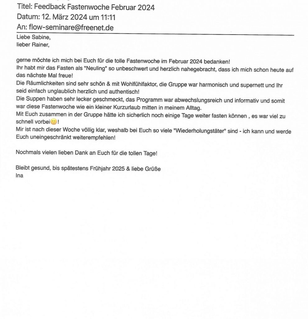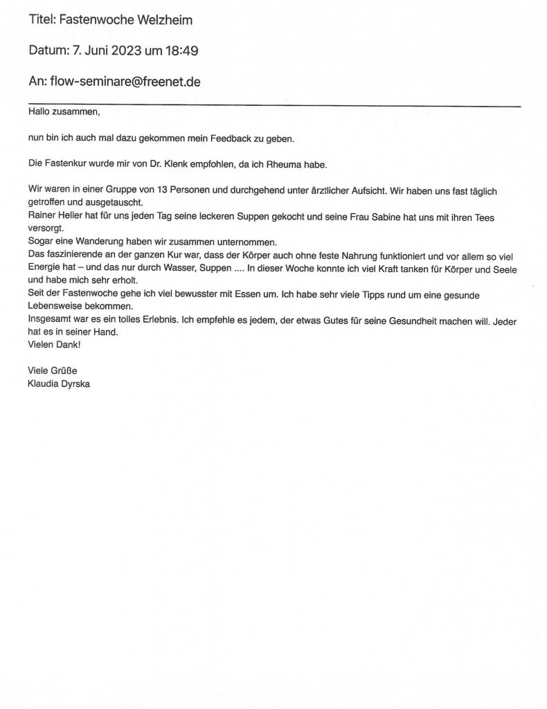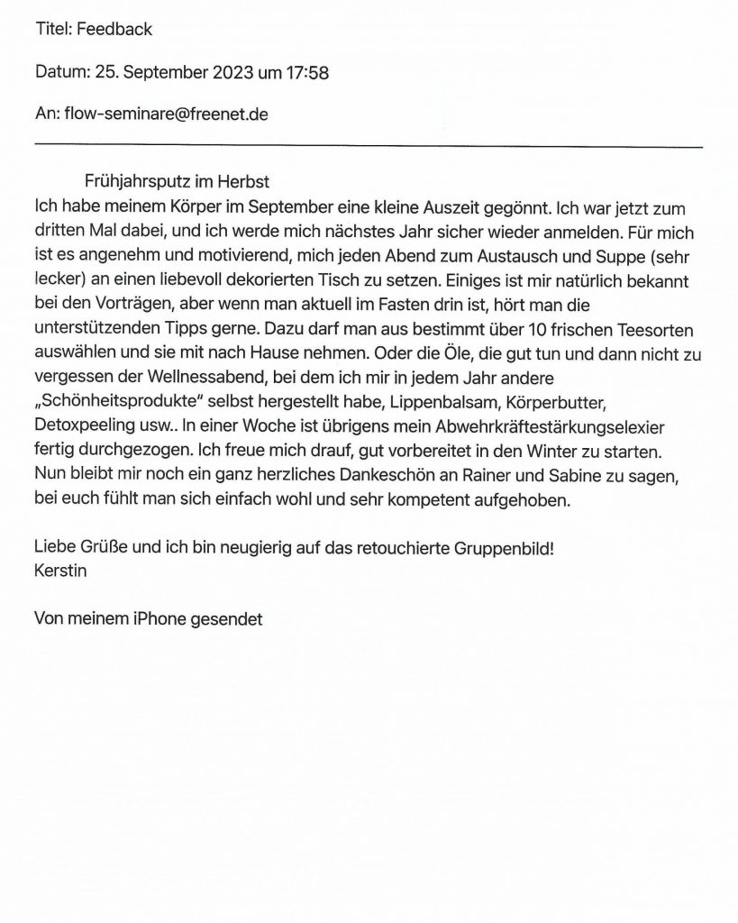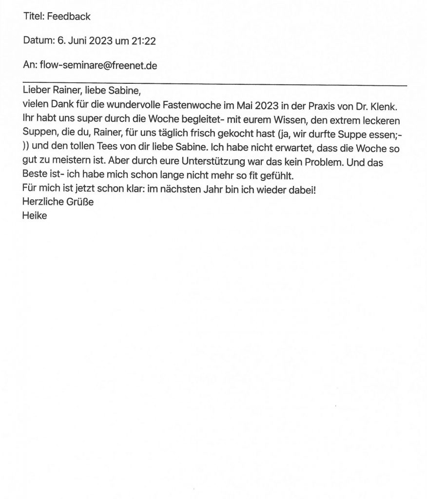 Sie haben bereits bei unseren Fastenkursen teilgenommen? Dann würden wir uns sehr über Ihre Bewertung freuen, schicken Sie uns dazu einfach eine Mail an info@flow-seminare.com